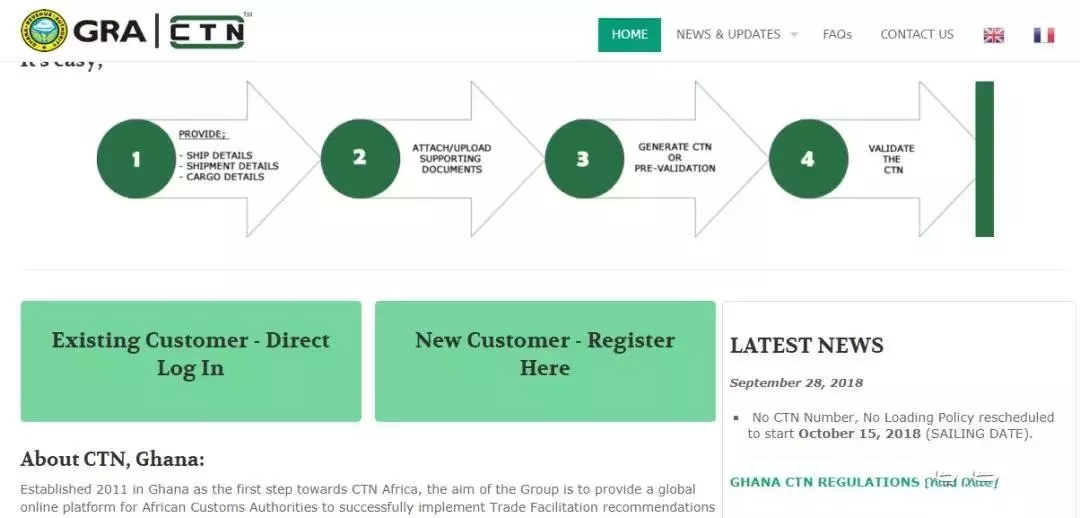 發(fā)貨人/承運人需在官網(wǎng)https://www.ctnghana.com/上傳以下文件:商業(yè)發(fā)票、出口報關(guān)單掃描件(符合要求的報關(guān)預(yù)錄單也可以)、裝箱單,24-36個小時內(nèi)會得到一個未生效的CTN號碼。
