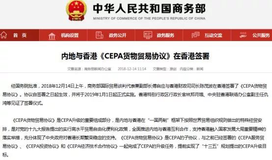 國務院批準,2018年12月14日上午,商務部國際貿易談判代表兼副部長傅自應與香港財政司司長陳茂波在香港簽署了《CEPA貨物貿易協議》。